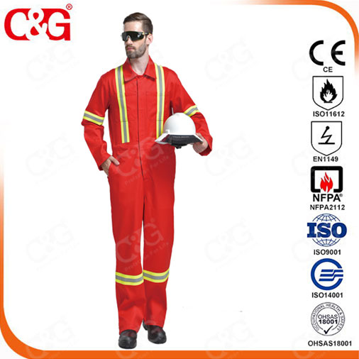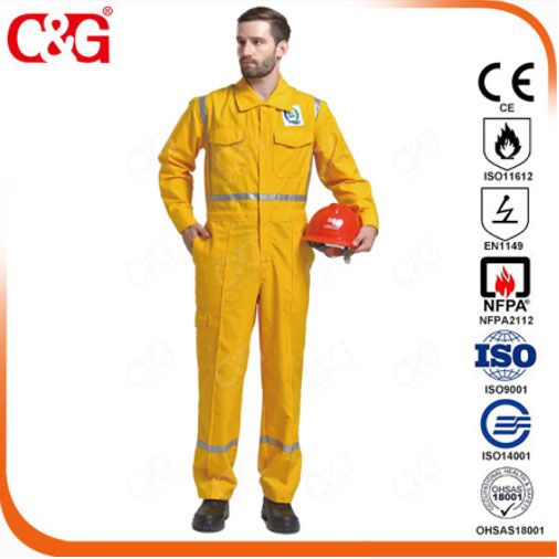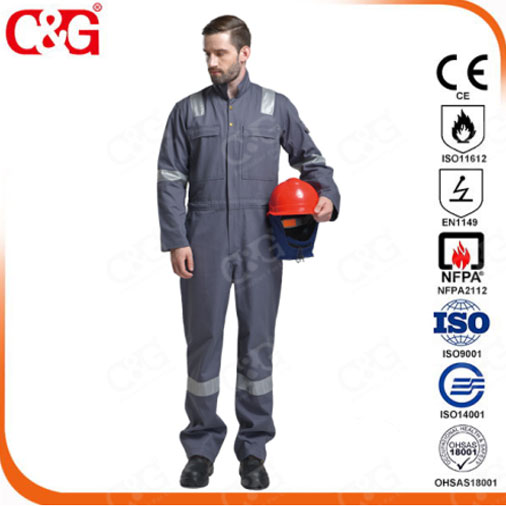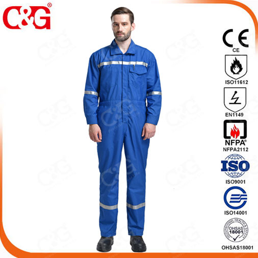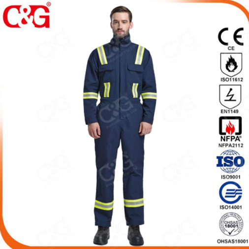 阻燃服采用阻燃面料,其面料中阻燃纖維使纖維的燃燒速度大大減慢,在火源移開后馬上自行熄滅,而且燃燒部分迅速炭化而不產生熔融、滴落或穿洞,給人時間撤離燃燒現場或脫掉身上燃燒的衣服,減少或避免燒傷燙傷,達到保護的目的。