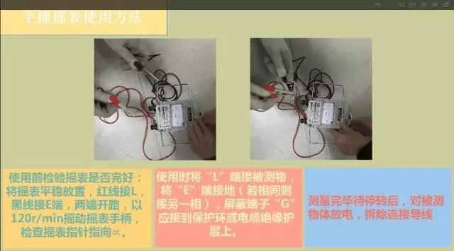 兆歐表有手搖式搖表與電子搖表,并設(shè)有不同的電壓等級(jí):400V及以下選擇500V搖表,1KV-6KV選擇2500V搖表。測(cè)絕緣時(shí)應(yīng)按設(shè)備電壓等級(jí)正確地選擇搖表。在測(cè)量之前檢驗(yàn)被測(cè)設(shè)備是否帶電,保證人身安全,若帶電則應(yīng)終止操作,在將帶電設(shè)備斷電隔離后才可進(jìn)行測(cè)絕緣操作。400V設(shè)備可用驗(yàn)電筆或萬(wàn)用表進(jìn)行驗(yàn)電。大于或等于1KV的用高壓驗(yàn)電器進(jìn)行驗(yàn)電。高壓驗(yàn)電器分為不同電壓等級(jí),其絕緣桿長(zhǎng)度隨電壓等級(jí)升高而升高,絕緣特性隨電壓等級(jí)升高而升高,因此在選用驗(yàn)電器時(shí)要注意,若所選驗(yàn)電器絕緣等級(jí)不夠會(huì)有觸電的危險(xiǎn)。
